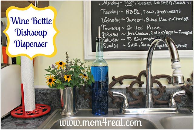 4. Wine Bottle Soap Dispenser: I like wine, but hate dishes, so Im trying to trick myself maybe if there is a wine bottle involved, dish washing will be more fun? We will see. This was such a fun little project, and super easy too! I started by emptying a wine bottleummmby drinking some wine. I then smeared dish liquid all…Read More (via Mom 4 Real)