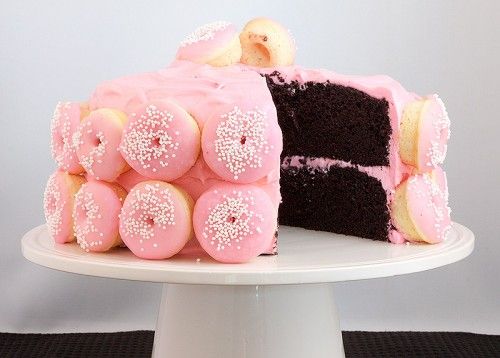 12. Pink Donut Cake: Birthday Celebration Cake-Moist Chocolate Cake with White Chocolate Cream Cheese Frosting tinted pink and decorated with Baked White Chocolate Cake Doughnuts. (via La Mia Vita Dolce)