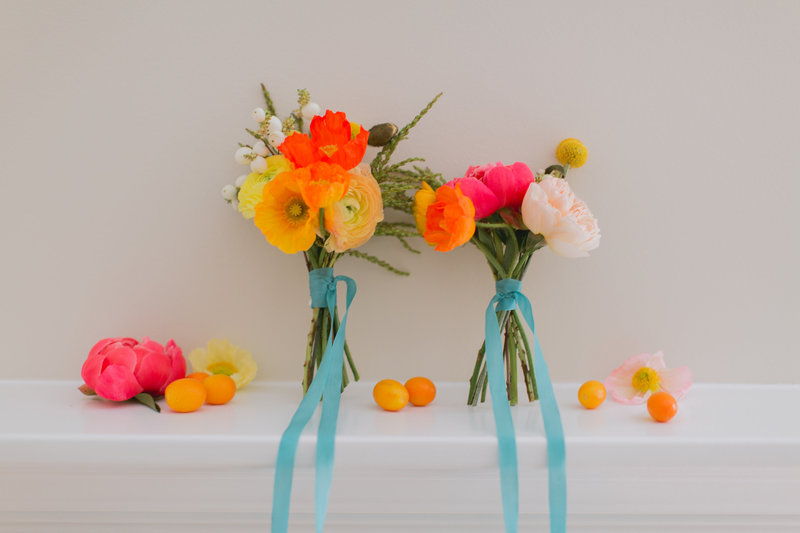 7. Mini Citrus Bouquet: Project by Janie Medley Photos by Tori Watson of Marvelous Things Photography. These vibrant bouquets are perfect for spring or summer weddings for brides on a budget. How cute these would be for the bridesmaids!? The citrus color palette is so yummy and cheerful! Before you begin to design the bouquets, clean the stems of the flowers and cut them and give the stems a trim and place in clean, cool water until you are ready to begin the desig… (via Project Wedding)