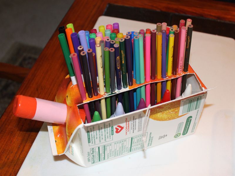 11. Recycled Juice Carton Desk Organizer: What you will need: – empty juice carton – craft knife – recycled twine – hole punch – your child’s art supplies Step 1: Preparation Thoroughly wash and dry the inside and outside of the orange juice container. Use your craft knife to cut a large flap on the front of the carton. Then, repeat on … (via inhabitots)