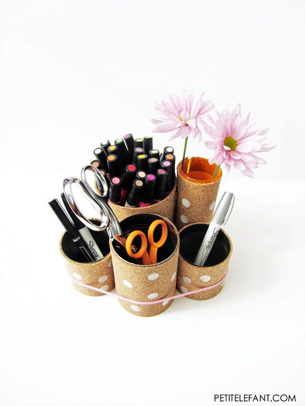 25. Polka Dot Tin Can Desk Organizer: A great do-it-yourself can desk organizers tutorial using tin cans and some cork to soften up the edges. Decorate with polka dots and you’re on your way! (via Petit Elefant)