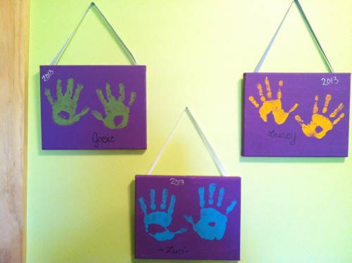 24. Family Handprint Canvas: Make DIY gifts for someone you love from the entire family! Or on second thought, you might want to keep this one for yourself. Supplies: any color paint, canvases and paint brushes. Step 1: paint the back of each canvas the background color you prefer. Step 2: gather color for handprints and paint child’s hand. (via Green Kid Crafts)