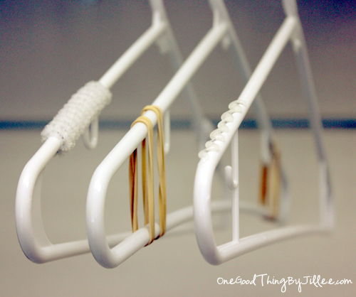 25. No Slip Hanger Solutions: I have posted about making your own No-Slip Hangers once before here. These were pretty much life-changing for me! ???? I cant tell you how aggravated I would get over shirts, sweaters, skirts and dresses slipping off the ends of the hanger and onto the floor in a heap! It was almost a little ridiculous. (via One Good Thing by Jillee)