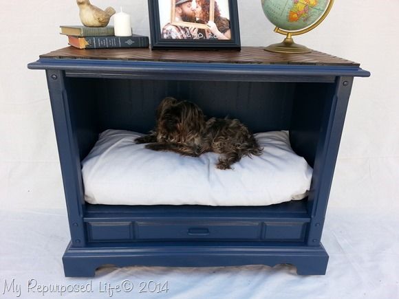 2. Repurposed TV Stand Pet Bed: How to do a chevron table top pattern with repurposed shutter slats on an old console tv stand. Some may call it a herringbone table top. (via My Repurposed Life)