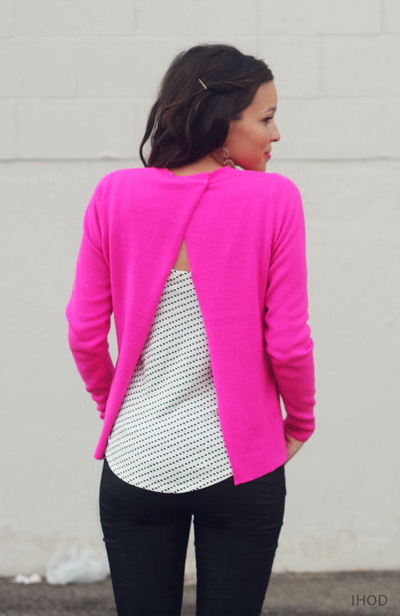 22. No sew Open Back Sweater: I had a few boxy sweaters in my closet that were brand new but weren’t quite flattering. I didn’t want to get rid of them so when I saw this sweater it gave me the idea to re-vamp them into a new style. I now will use these all the time in the cooler months (via In Honor of Design)