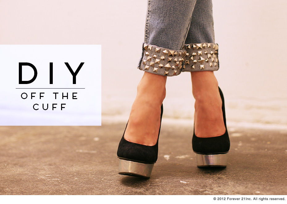 27. Studded Cuffs: Denim is the one item we just cant seem to get enough of, and since we are always on the hunt for new ways to spruce up our everyday basics, we figured it perfect to show you how to get a pair that will totally put your other jeans to shame. We used a few supplies (really, only three) for this super simple DIY that will take your jeans to the next level. Stud on! What you’ll need: -Jeans (shop F21 denim here!) -Pliers -Assorted studs Steps: 1. Lay out your supplies. 2. Decide on the size of your embellished cuff and fold the bottom of the denim up to create a cuff. 3. Choose a stud pattern. We chose a mix of silver studs to go with our light denim. 4. Stud from the front to back and bottom to top using the pliers to bend the stud prongs through the denim. Be careful; they can be sharp! 5. Repeat on the other leg. Don’t forget the back! 6. Take em for a spin! (via 21st Street Blog)