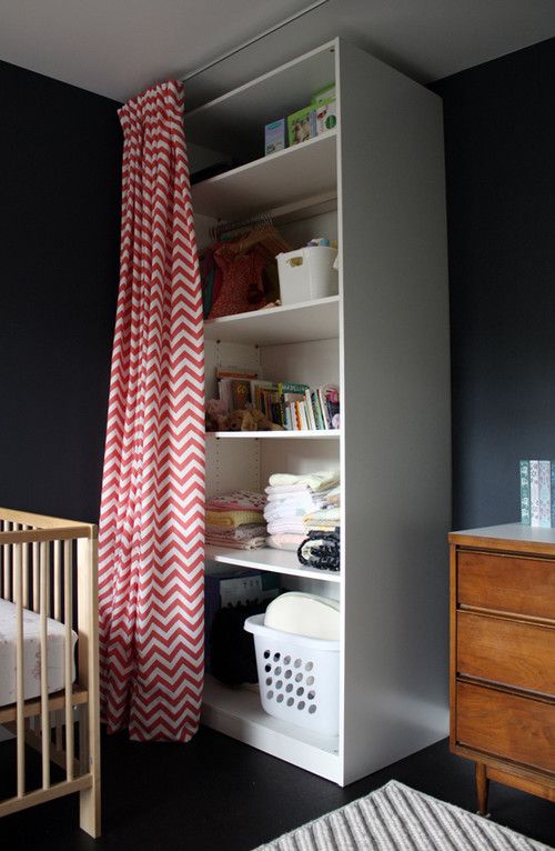 17. Hide storage areas with ceiling-mounted curtains: Keep your wee one’s stuff under control and your nerves unfrazzled with these space-saving storage and baby-gear ideas (via Houzz)
