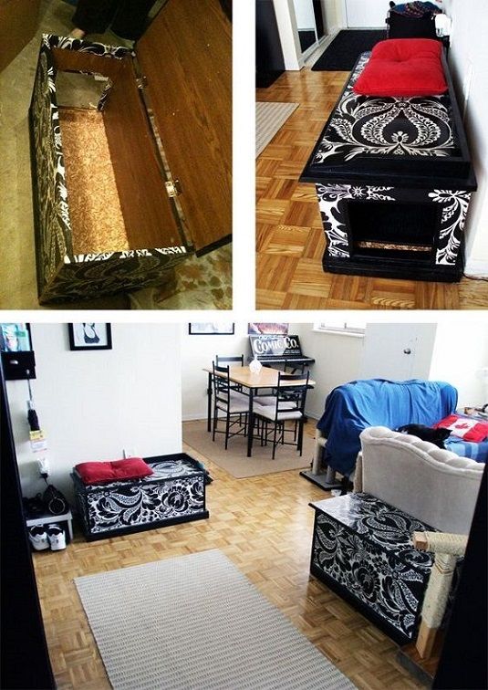 12. Chic Damask Litter Box Hack: Lenna made very elegant stealthy litter boxes — and they serve double duty as entrance benches. Read her post to learn what else she made to entertain two spoiled cats. (via @offbeathome)
