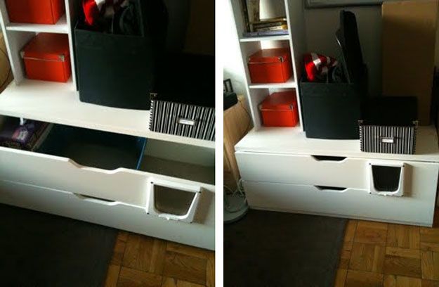 15. Bedroom Litter Box: Materials: Stolmen Chest with 2 drawers Description: We share our bedroom with the cats litter box, which is the only suitable space in our apartment. I came across this site a few months ago and was inspired to make a hack that would hide the box and allow us to use the space above it. (via IKEA Hackers)