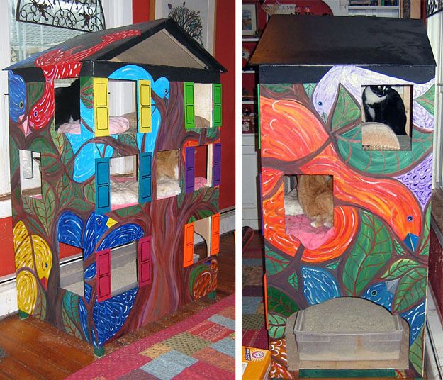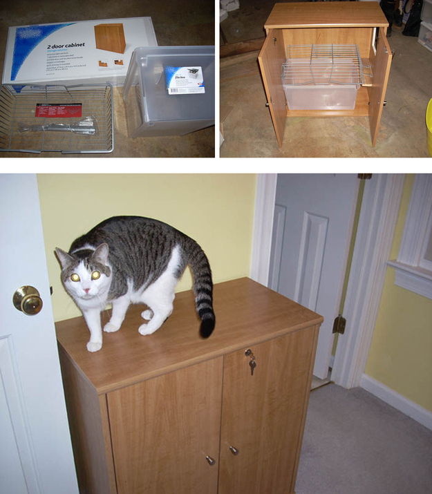 18. Hide in Plain Sight Cat Litter Box: Build a cat litter box that can be placed anywhere in your home. Once you have the concept down, you’ll need to go shopping for materials. We found the kind of storage cabinet we wanted for this project, took measurements at the store, then went hunting for a plastic container to serve as a litter tray. An inverted wire storage drawer served as an entrance/exit deck. We also needed four 1″ L-brackets. (via Kiribub)