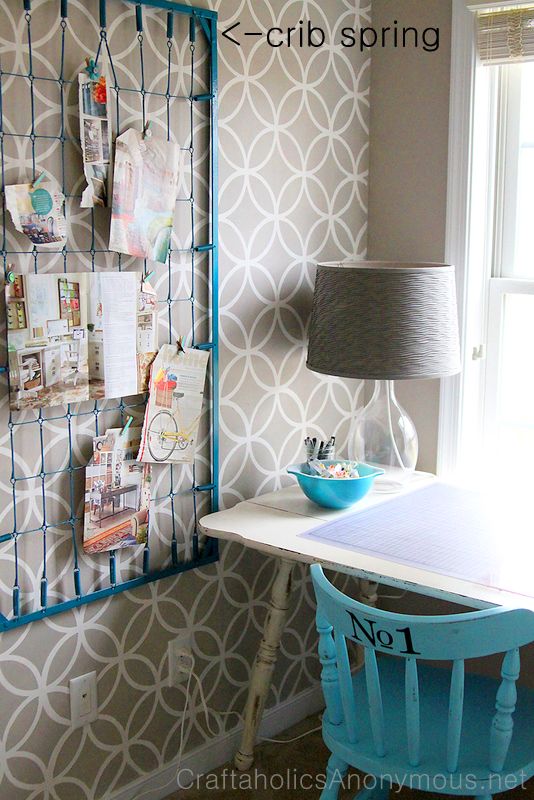 Old Crib Spring to Inspiration Board2. Old Crib Spring to Inspiration Board: Take a tour of this amazing Craft Room! Clever ideas & tips for storage and organization. This is one craft room you don’t want to miss! (via Craftaholics Anonymous)