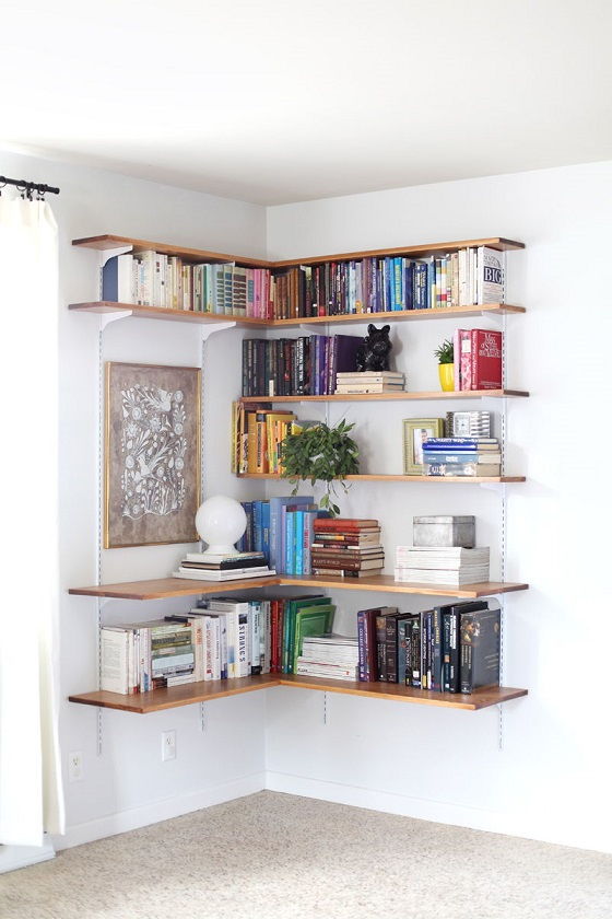 8. Corner Shelving System: Hi, it’s Mandi from Making Nice in the Midwest. When my husband and I first moved into our ranch home two years ago, we weren’t quite sure how to fill out the long living room space, but we were sure we wanted some extra storage for our modest collection of books. After quite some time of living with this empty corner of the living room, I decided the perfect solution… (via A Beautiful Mess)