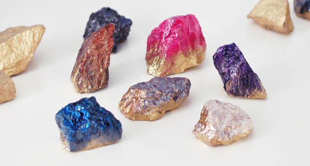 14. Faux Crystals: DIY your own crystals for decor purposes to use as accents, bookends, paper weights, & more, using regular jagged rocks, nail polish, & gold spray paint! (via …love Maegan)