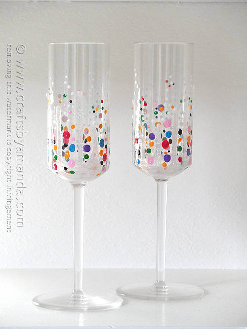 28. Confetti Champagne Glasses: Here’s a pretty way to dress up your glasses for the big New Years Eve celebration. They sparkle and shine as the lights bounces off the glitter drips. Your guests will love them! A fun way to usher in the new year with friends. FYI air drying is 21 days HOWEVER you can still Read More (via Crafts by Amanda)