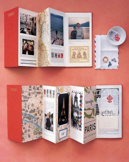 16. Accordion-Style Travelogue: A travel scrapbook can showcase photographs from your trip as well as printed ephemera gathered along the way, such as business cards, wine labels, cafe napkins, and sightseeing scraps. (via Martha Stewart)