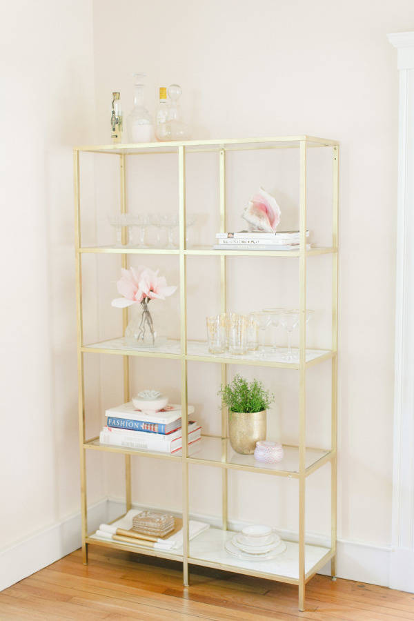 19. Gold and Marble Shelves: Its no secret that gold is all the rage these days, which is why I’m particularly obsessed with this gilded DIY bookshelf. Originally purchased at Ikea, we’ve given this simple etagere an immediate upgrade with a little gilded love, and some marble contact paper. The best part? The entire thing can be done for $100 [] (via Style Me Pretty)