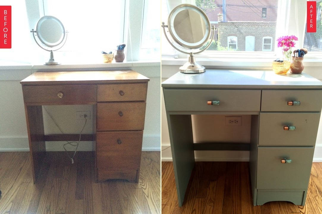 23. From Drab Desk to Painted Vanity: I was “gifted” this really simple, but classic desk from my boyfriend to use as a makeup table/vanity. While I loved the character, the desk was pretty beat up. There were imprints and scratches on the top and the knobs mismatched. I decided to take on my first larger project in my new apartment and (via This Life Styled)