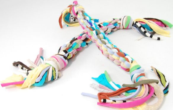 6. Braided Toy: To make this great toy for your dog I used, 12 strings t-shirt yarn from about 1,2 yard long. You divide the string in four parts from 3 strings and start the scoubidou technic, one I did with the round technic and one with the straight technic When you want to see the full explanation (via LVLY)