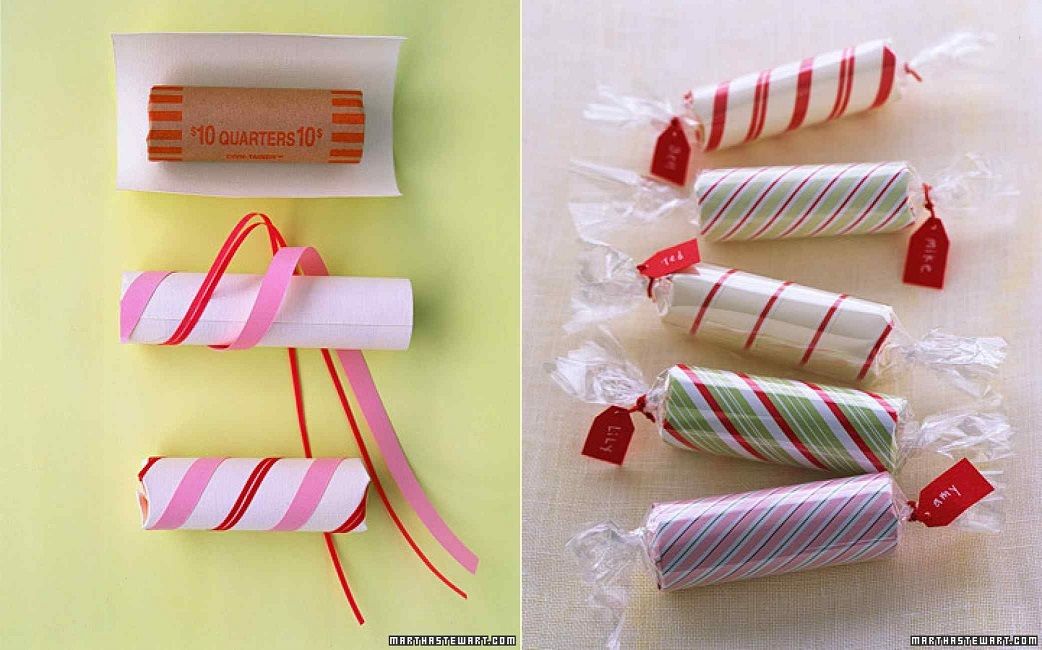27. Candy Coins: Quarters come in handy at the newsstand, campus laundries, and video arcades; transit tokens are appreciated by commuters. Cover their utilitarian wrappers with candy cane hues. (via Martha Stewart)