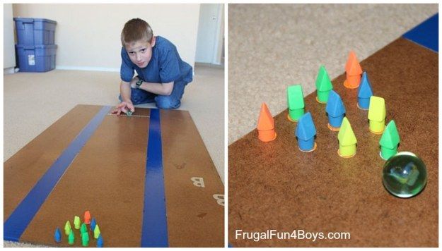 3. Marble Bowling Game: DIY Marble Bowling with Pencil Eraser Pins Last spring, we sold our home and moved into a larger home, which we actually purchased from friends. Their kids are older than ours, and so as they cleaned out items and packed, they ended up leaving behind a few things for the boys, including the game room…Read More (via Frugal Fun for Boys)