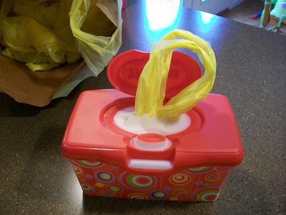 26. Turn empty baby wipes container to a pop-up bag dispenser (via A Simple Heart for Home)