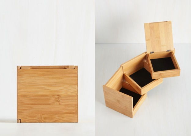 8. This space-saving jewelry box: Your growing accessory collection won’t clutter the space on your vanity as long as this sleek jewelry box sits beside the mirror! An elegantly unassuming design crafted from bamboo, this chic cube blooms into three square shelves after lifting its lid. Joined by hinges at each seam, its tiered trays cradle your most cherished pieces with a soft, black lining. Whether its crisp silhouette conceals your eclectic array or you have it unfurled while you get ready for an event, this cool case makes a marvelous addition in your minimal abode! (via ModCloth)