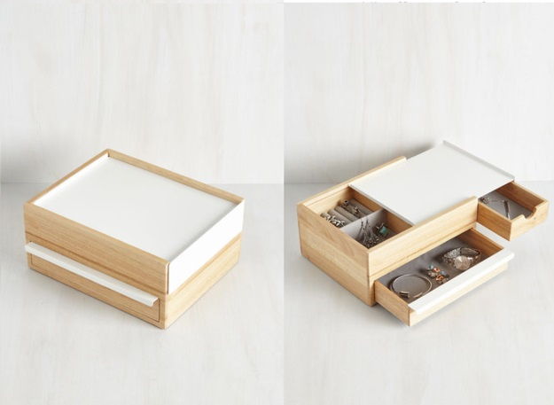 25. Terrifically Tucked Away Jewelry Box: While your accessorizing tastes run the gamut, your home design is neat and tidy. This wooden jewelry box hides your trinkets away so the sparkle and shine can be saved for your ensemble! Grey velvet lining, white metal accents, and a nifty design of drawers and compartments characterize this clean-looking storage piece! (via ModCloth)