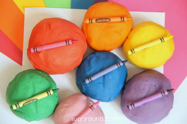 27. Crayon Play Dough: Create your own crayon play dough using real crayon pieces, melted down in any color of the rainbow. (via Sugar Aunts)