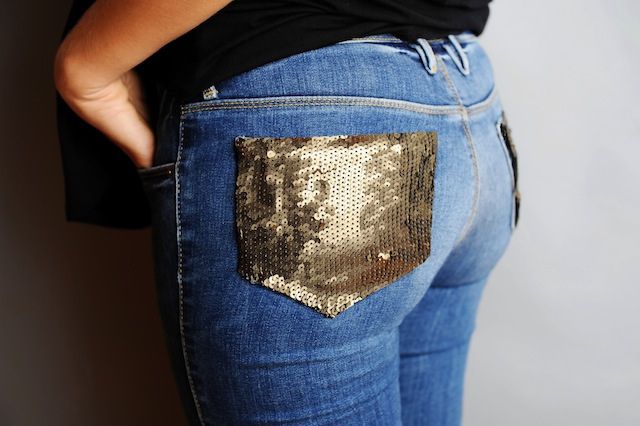 18. Sequin Pocket Jeans: If you’re thinking it’s time for another ‘just add sequins’ project, you’d be right! I spied these amazing jeans recently and wanted desperately to recreate the look, but when I tested out it out by pinning the sequin pieces to the knees I found they didn’t have the same effect (I have a feeling… (via a pair & a spare)