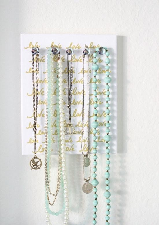 13. Canvas Necklace Organizer: Create a gold writing canvas necklace organizer DIY to hang your fave pieces of jewelry on! A simple gold painted necklace holder that you can personalize! (via Melissa Creates)