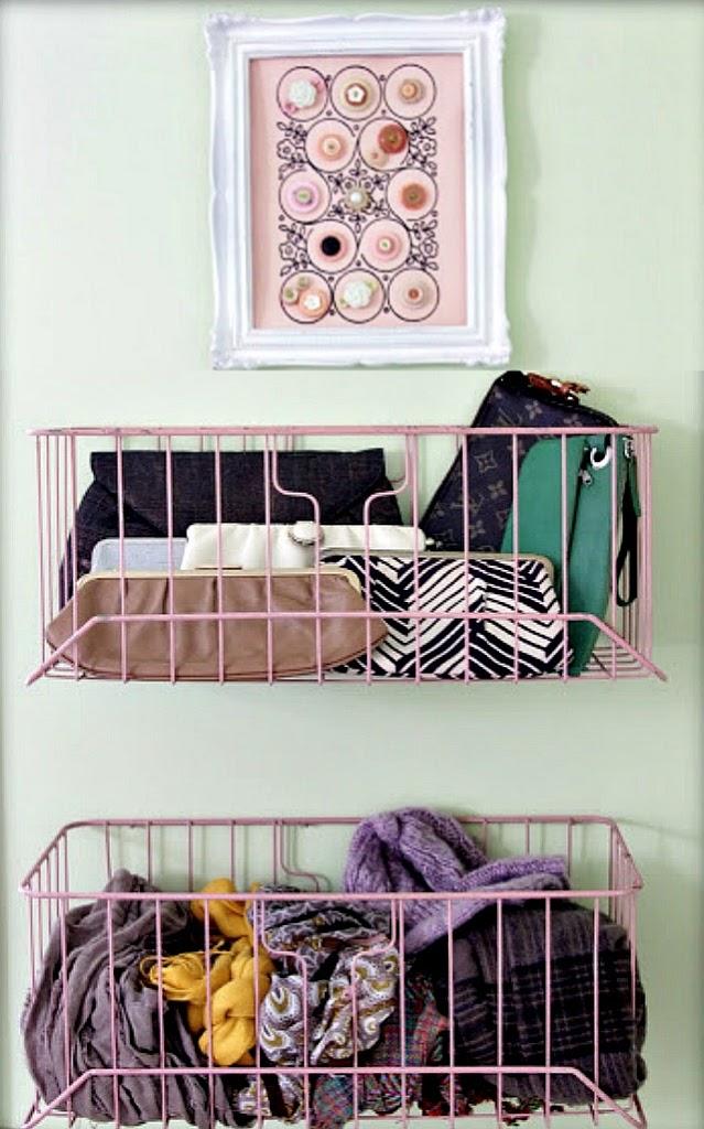 15. Hang Wire Baskets for More Extra Storage: Use vintage wire baskets to hold accessories in a bedroom. (via The Decor Fix)