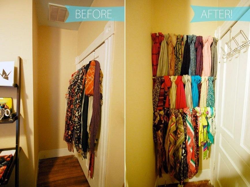 35. Use small tension rods to the make the most of tiny, blank spaces: I may have a bit of a scarf addiction. With practically nonexistent closet space, they were taking over the hooks on my bedroom door. Not only was it an eyesore, it was impossible to grab a coat or scarf without creating an avalanche of accessories. This weekend, I found a solution that was quick, inexpensive, and visually interesting. Check out the after, after the jump! (via Apartment Therapy)