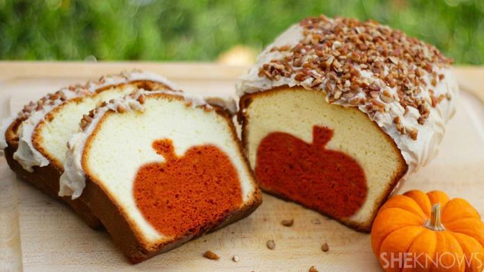 20. Peekaboo Pumpkin Pound Cake: Baked pumpkin pound cake with brown butter pecan icing and a surprise pumpkin center. (via She Knows)