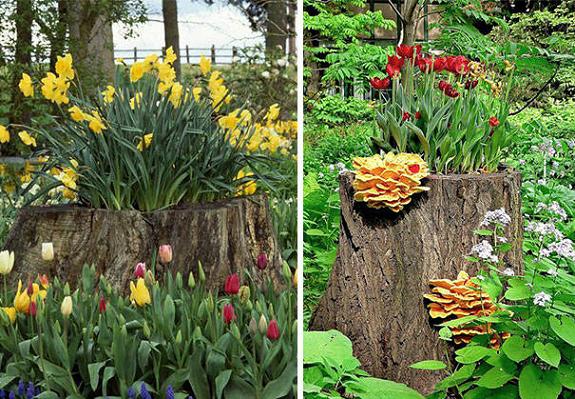 17. Tree Stumps for Yard Decorations: Tree stumps can be annoying eyesores that remind of dead or broken trees. Recycling tree stumps for yard decorations and decorating them with flowers are a wonderful way to remove stumps naturally and (via Lushome)