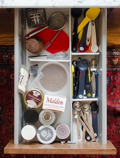 15. How to Organize Measuring Spoons: I am in the process of setting up a new kitchen, with all the decisions, indecisions, and rearrangements that settling into a new cooking space entails. Every time I start in a new space, there’s fresh resolve to fix the things that drove me crazy in the last one. This time, for instance, I decided to create order out of the tangled mess of my measuring spoons. Here’s how I organized them, and why. (via The Kitchn)