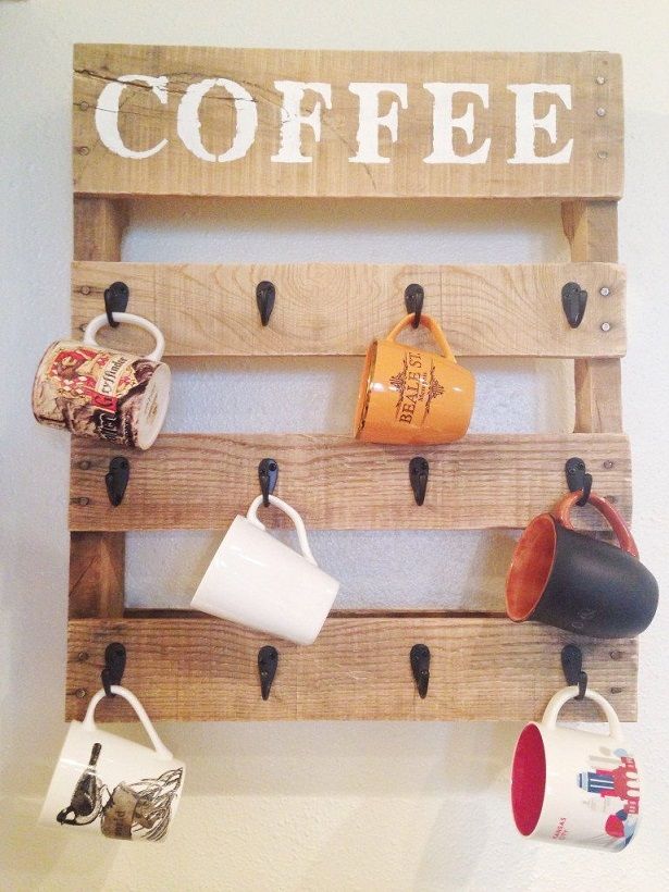 14. Coffee Cup Holder: Im so excited to share one of my favorite projects to date! We picked up a pallet off the side of the road when we were living in Springfield and I had been mulling over what to do with it f (via One Little Bird Blog)
