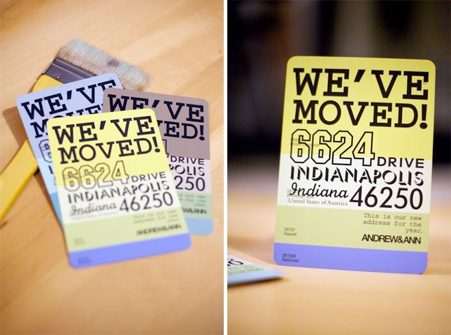 12. Moving Announcements: This just might be my new favorite moving announcement idea! Indiana-based wedding photographer Ann Lang managed to track down postcard-size paint chip samples that she ran through her home printer to make a perfect and totally budget-friendly moving announcement. From Ann: My husband and I wanted to find an inexpensive way to let our family (via Oh So Beautiful Paper)