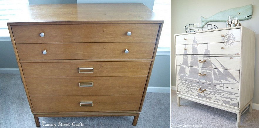 17. Thrift Store Chest Makeover: Chalk painted chest of drawers with a hand painted ship silhouette for a nautical themed bedroom. (via Canary Street Crafts)