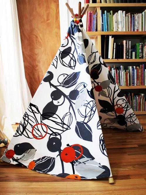 26. Ikea Fabric Teepee Tent: I made this teepee for Ada when she was little, (although I think technically Santa gets the credit). She and Josie have been using it to play at camping in their room together lately. Our teepee is based loosely off of this pattern by Sew Mama Sew. Ikea has lots of inexpensive upholstery fabric in (via Domesticspace)