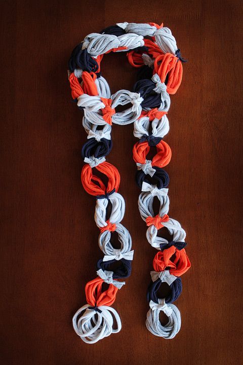 4. Ringlet T-shirt Scarf: This little ringlet scarf made out of old t-shirts is so fun for fall! There’s no sewing involved (hallelujah!), and you can make it while sitting in front of the TV in less time than it takes to watch a really good, trashy show on E. Since I have an abundance of orange and blue (via Kevin and Amanda)