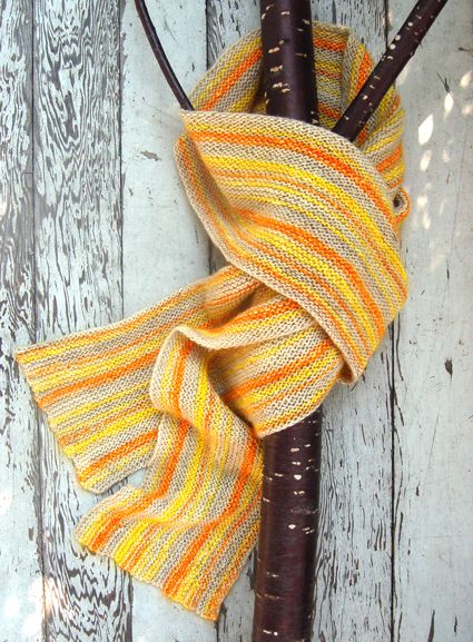 Sunshine Scarf2. Sunshine Scarf: I feel a little guilty divulging this information, as if I’m betraying the whole rest of the spectrum, but I have to admit that I have a favorite color… yellow. And not just any yellow, not baby yellow or lemon yellow or mustard yellow, but deep and bright and clear sunshine yellow, the kind of yellow that emits its own light and whistles its own carefree tune. When it comes to this kind of yellow, Alchemy is the master, hands down. Alchemy’s yellows are saturated and fresh, like pollen-soaked blossoms. Using them to make a scarf in August feels like the perfect way to bring the heat of summer into the upcoming crisp nights of autumn. While Madeline Tosh’s beautiful Tosh Merino Light serves as the soft, neutral ground, Alchemy’s Kozmos provides the entertainment, not only with its splash of intense color, but also with its play of texture: a little fuzzy, a bit shiny, and a lot gorgeous! (via Purl Soho)