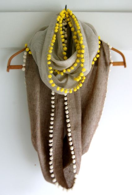 29. Pom Pom Infinity Scarf: This summer on the streets of Soho I noticed that last winter’s big cowl trend wasn’t going away, even in the hottest weather. Instead of the bulky knits of winter, these summer versions were sewn in lightweight silk, cotton, and linen fabrics and were worn like flowing necklaces over tank tops and sun dresses. I am someone who hates to be hot, so even though I admired these pretty summer scarves, I couldn’t imagine putting something extra around my neck in the sticky heat. But since the weather has started to cool down, I’ve been yearning for an oversized sewn cowl of my own! (via Purl Soho)