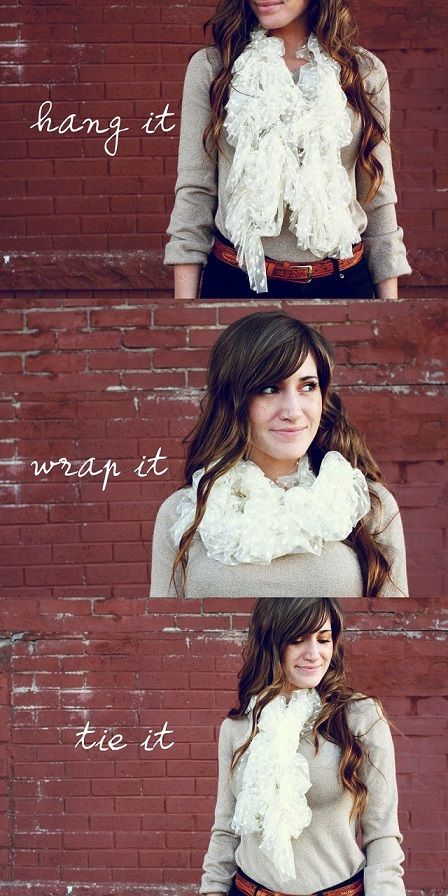 31. Lace Scarf: This next D.I.Y. is incredibly cute and easy too! Kinsey made this ruched scarf with a pretty polka dotted lace. You don’t need to own a sewing machine for this project and it only takes about 30 minutes to complete! Great gift idea? I think so. 1. Supplies Needed: You’ll need a large strip of lace fabric appx 3 yards long x 12 inches wide, white embroidery thread, and scissors…. (via A Beautiful Mess)
