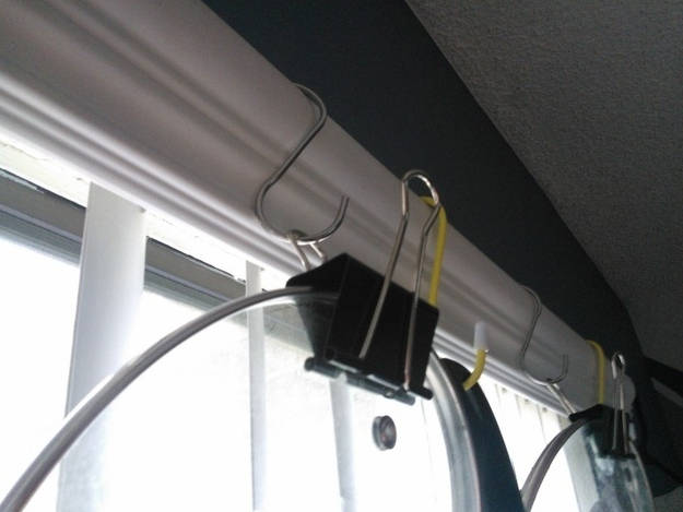 11. S-hooks and binder clips as pot storage: Wanted to save space for storing kitchenware. Hanging pots and pans are easy because they have the hole at the end of the handle, but the glass… (via Reddit)