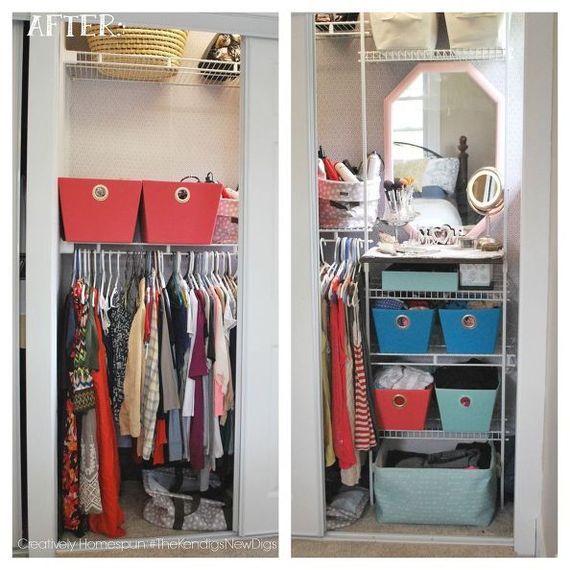 8. Use wire shelves and bins to squeeze more space into your closet (via Creatively Homespun)