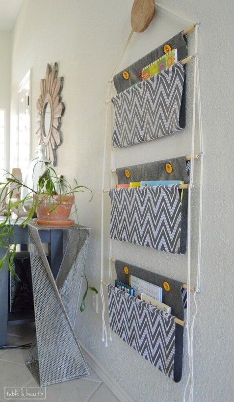 17. Hanging Book Holder: A great small space storage solution for all those books, especially all those children’s books. This hanging holder can be made in any fabric, in any size. (via Table and Hearth)