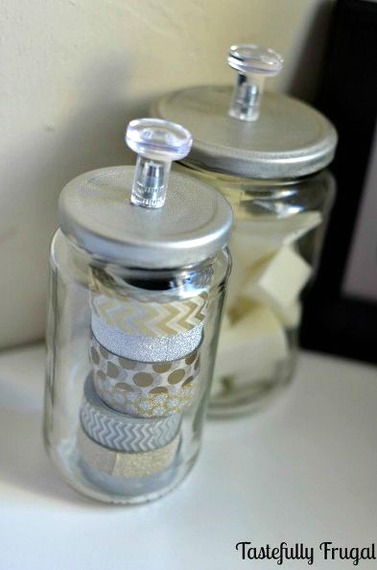 28. Add knobs to glass jars to create cute craft or makeup containers: Don’t throw those empty pickle jars away; make these cute storage containers for less than $1. I remember when I was 9 months pregnant with my first son, waiting every day for him to join our family (he was a few weeks past his due date) I stumbled upon this great website, Pinterest. (via Tastefully Frugal)