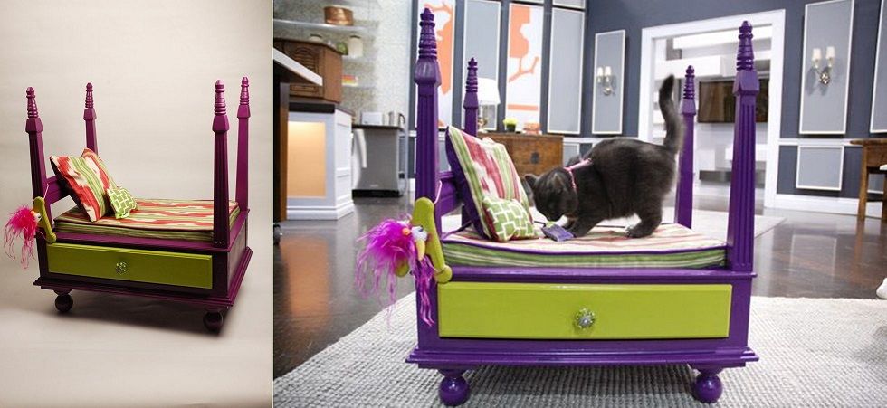 13. Four Post Pet Bed: Steven creates inexpensive pet beds inspired by those found in many retail shops.Four Post Pet Bed Here Steven used a recycled table and transformed it into a glamorous four-poster bed suitable for any small pet. Supplies4 legged side table Melamine paint Fence finials Small… (via cbc)