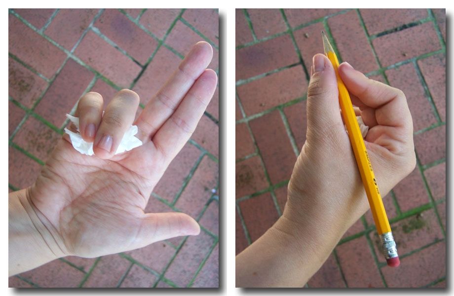 Teaching a Child To Hold a Pencil using a Kleenex3. Teaching a Child To Hold a Pencil using a Kleenex: I cannot take an ounce of credit for today’s little tip–my son’s preschool teacher taught it to me years ago. It’s such a good one, I couldn’t keep it to myself. You probably know how hard it can be to communicate to a child exactly how a pencil should sit… (via Rocks In My Dryer)