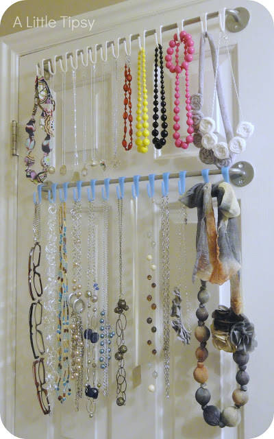 26. Backdoor Jewelry Organizer: I never had a great solution for jewelry. I had things in jewelry boxes, drawers and scattered around. I wanted something to not only keep it organized, but where I could see it all: rings, necklaces, bracelets and earrings together to coordinate quickly and easily. On a trip to Ikea I found some things that (via A Little Tipsy)